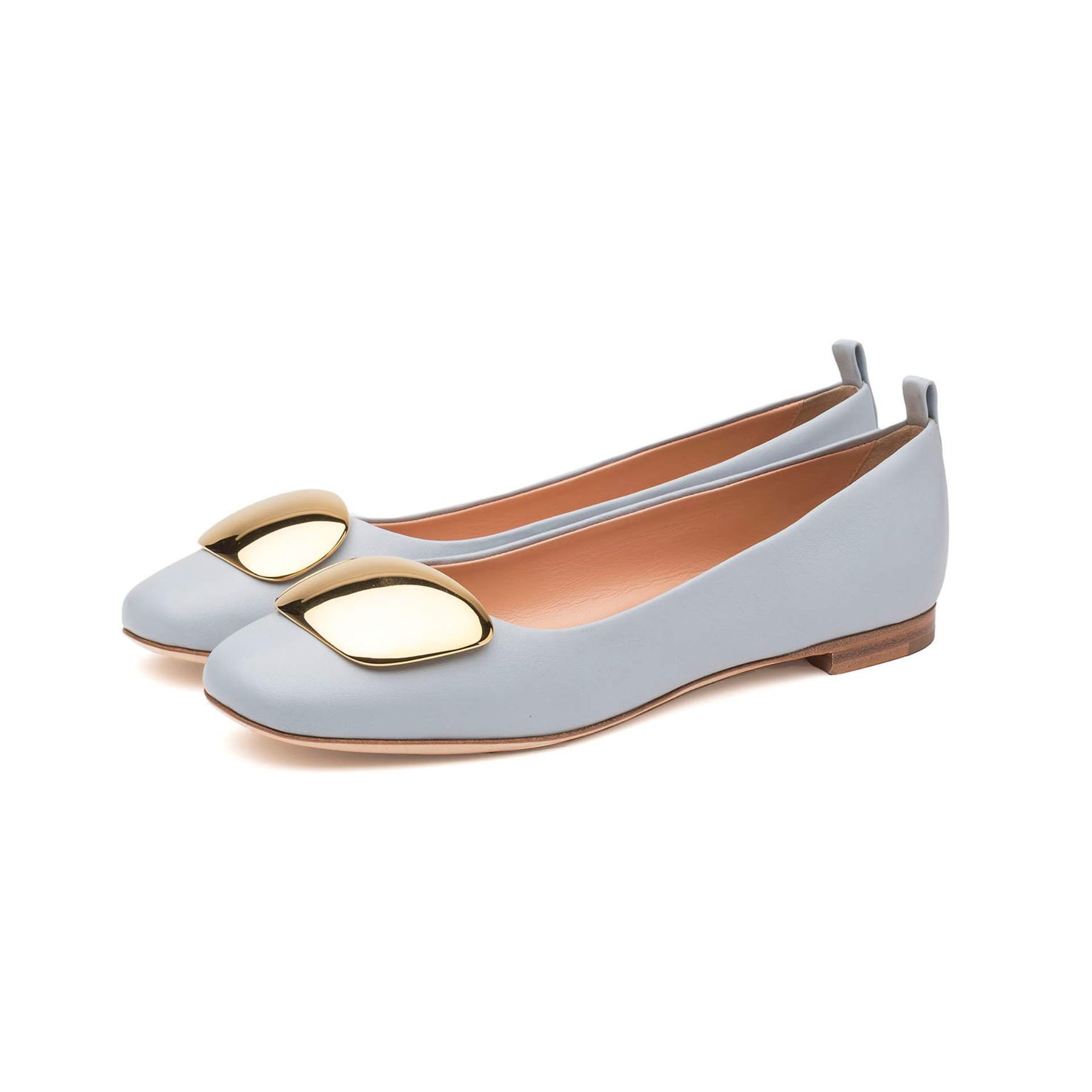 The Rupert Sanderson Vedette Arctic Nappa Gold features a rounded toe front and is crafted from smooth cool blue nappa leather. Accented with the signature gold chrome pebble, it offers a sleek, modern silhouette with a touch of sculptural elegance.