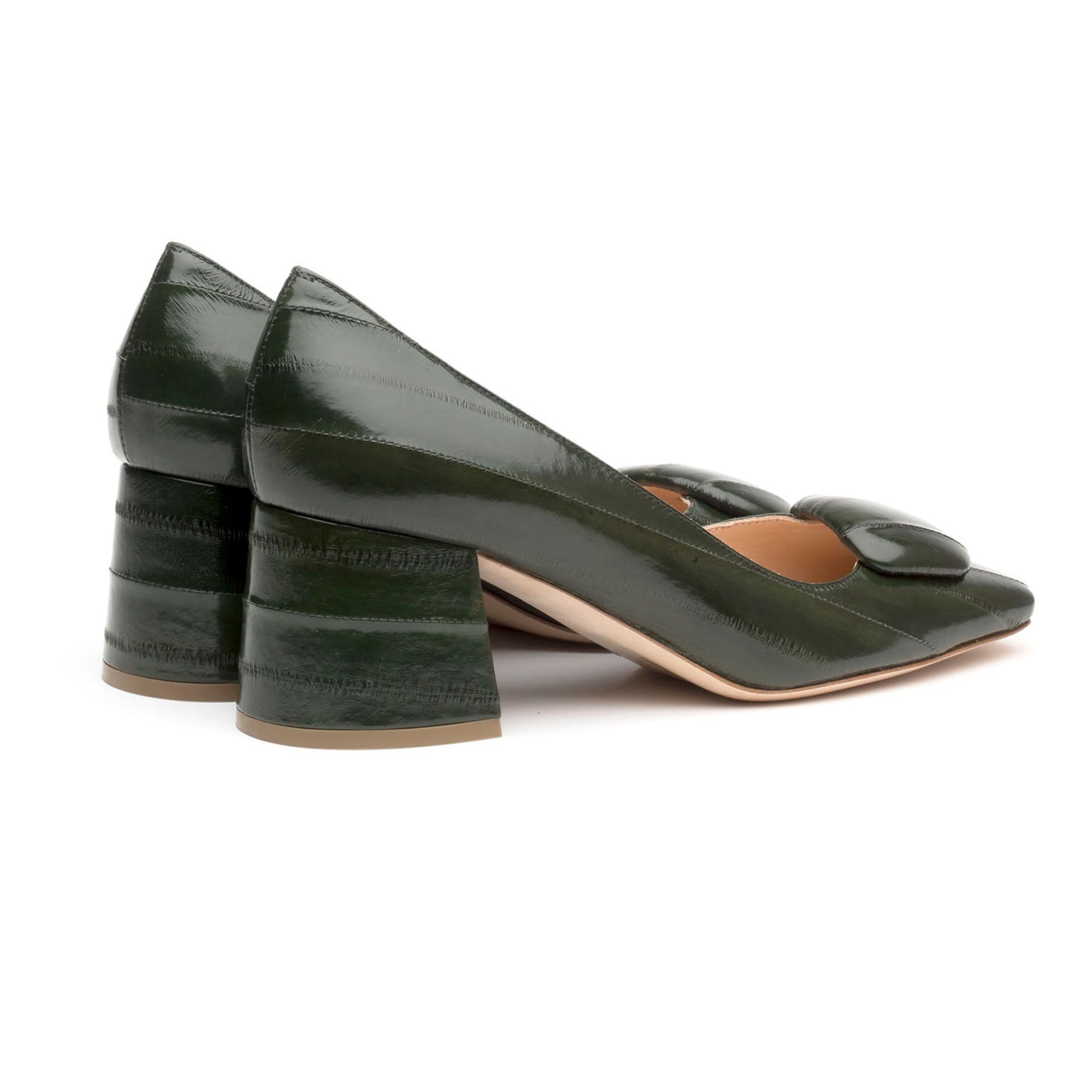 Naxos endures as a true classic, defined by its 60mm splayed block heel and refined square toe. This season, it is reimagined in smooth, glossy Hunter Green eel, striking and sophisticated. Finished with a covered pebble that lends a modern edge to its timeless silhouette.