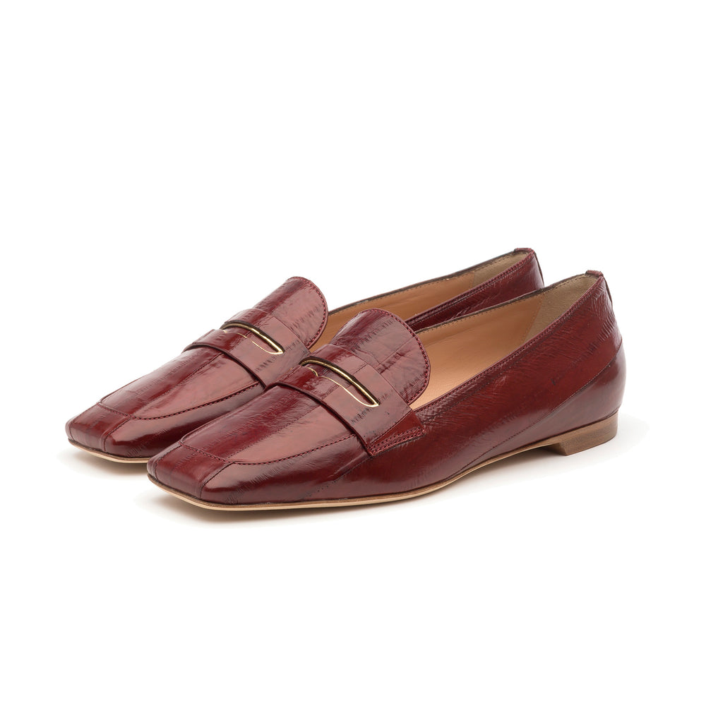Doublet returns this Fall in rich Merlot eel. This penny loafer, set on a 5mm monoblocco heel with a blunt square toe, blends masculine structure with retro-inspired shine for a stylish, modern finish.