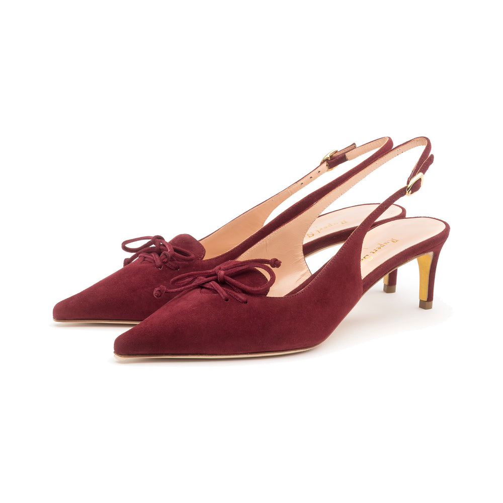 Gratia is our latest sling-back, designed with a refined silhouette and set on a 55mm heel. The subtle lace-up detailing introduces a touch of masculinity to its graceful form, while the rich Merlot suede in a deep burgundy hue makes it the perfect choice for autumn elegance.