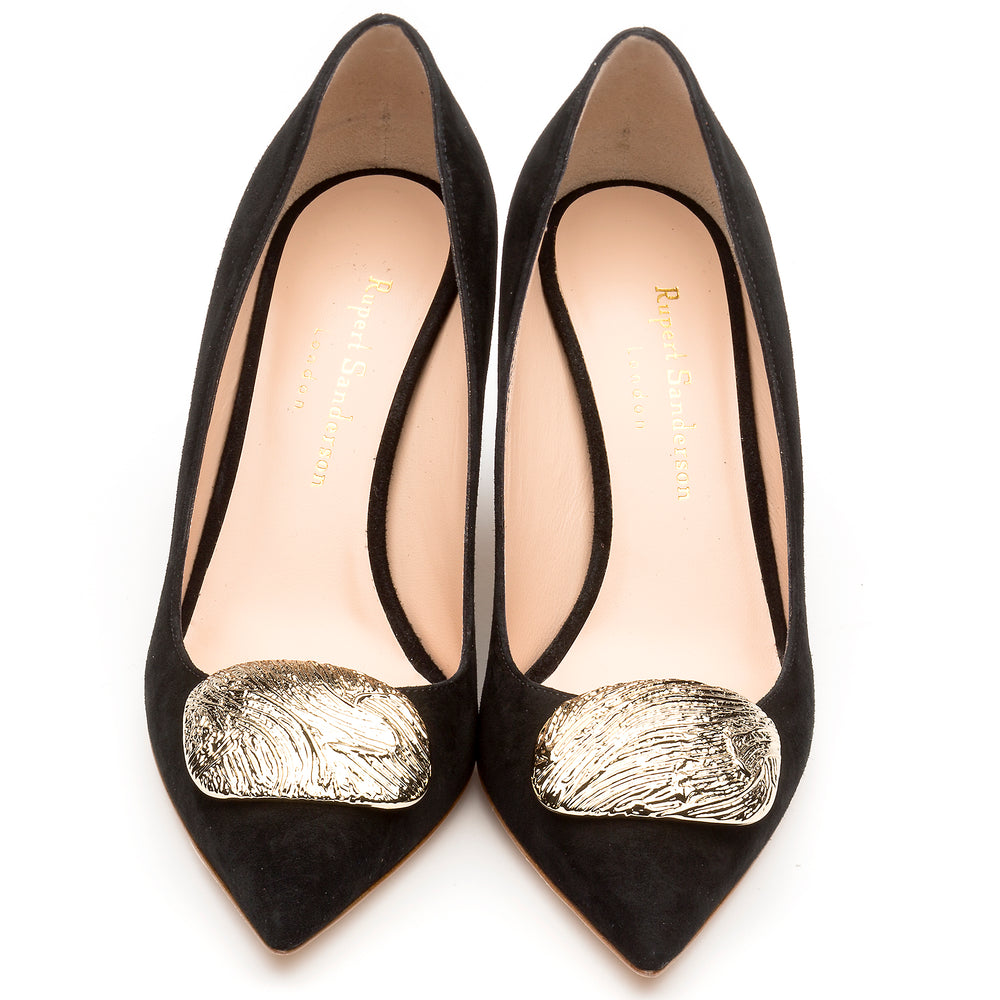 Nada's elegant silhouette and clean presentation make it an instant classic. It is crafted from black suede leather, topped with signature Platinnium Ripple Cromato pebble and sits on a comfortable 75mm slim stiletto heel. Pair this sleek pump with everything from jeans to mini dresses.