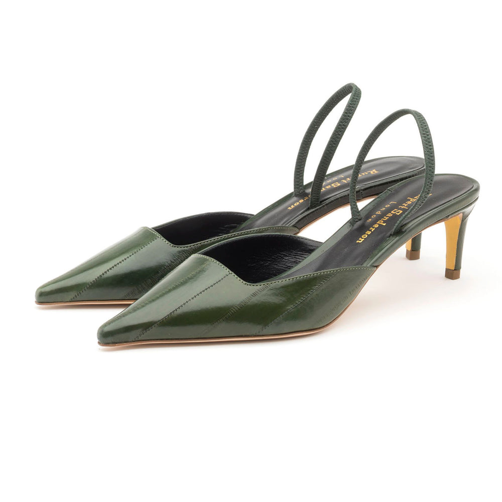 silhouette and 55mm slingback heel, it channels effortless versatility with a modern sharpness. In Hunter Green eel, the design takes on an added refinement - a true expression of autumnal elegance.