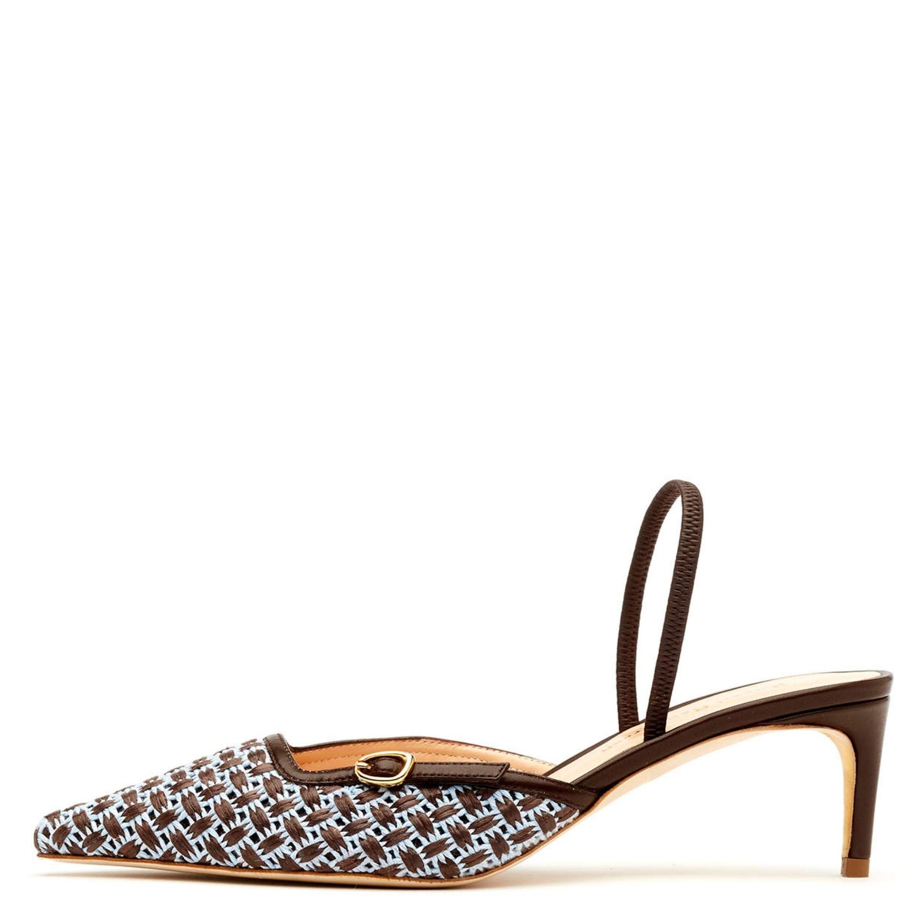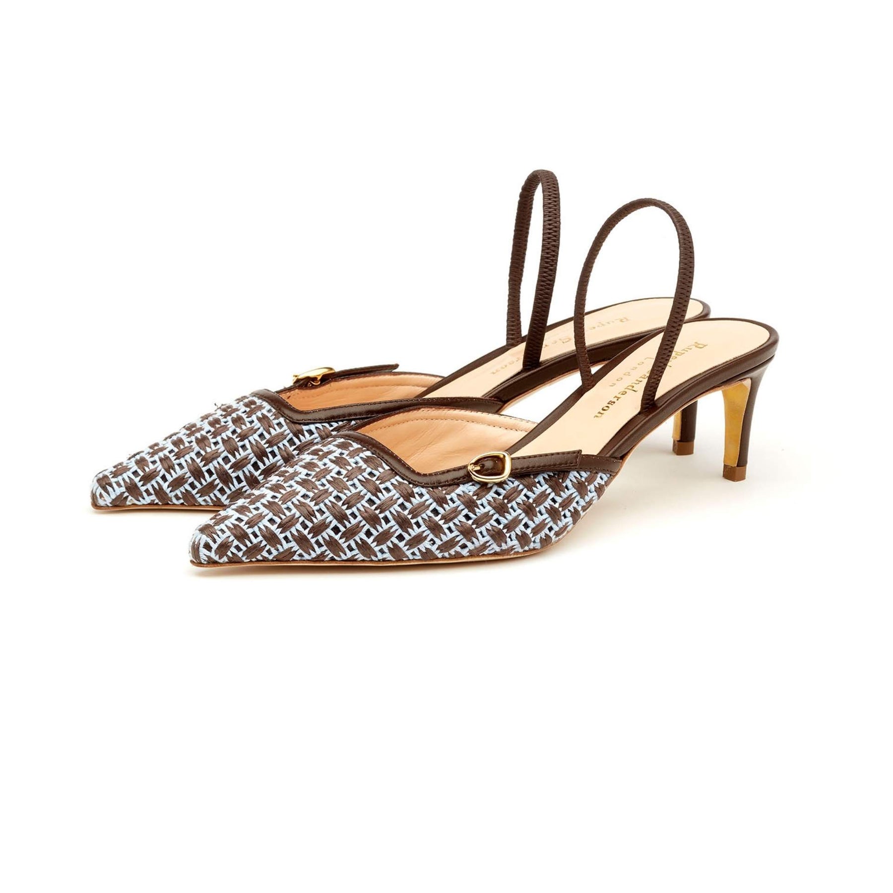 Rupert Sanderson Orono in Blue Basket Weave features a striking blue and deep brown coffee woven pattern. Set on a 55mm pointy slingback heel with an elasticated strap, it blends textured craftsmanship with sleek, contemporary elegance.