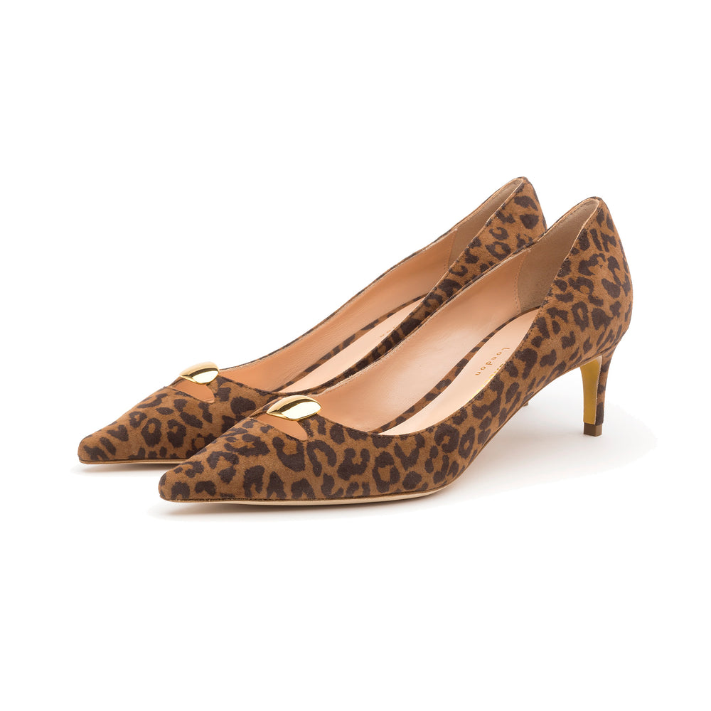 Sybilla makes its debut as the embodiment of the modern pump. Poised on a 55mm heel and crowned with a miniature of our signature chrome pebble, the silhouette is sculpted on the celebrated ‘Vanga’ last. Seasonal Leopardino suede enriches the design with depth and texture, uniting contemporary refinement with timeless elegance.
