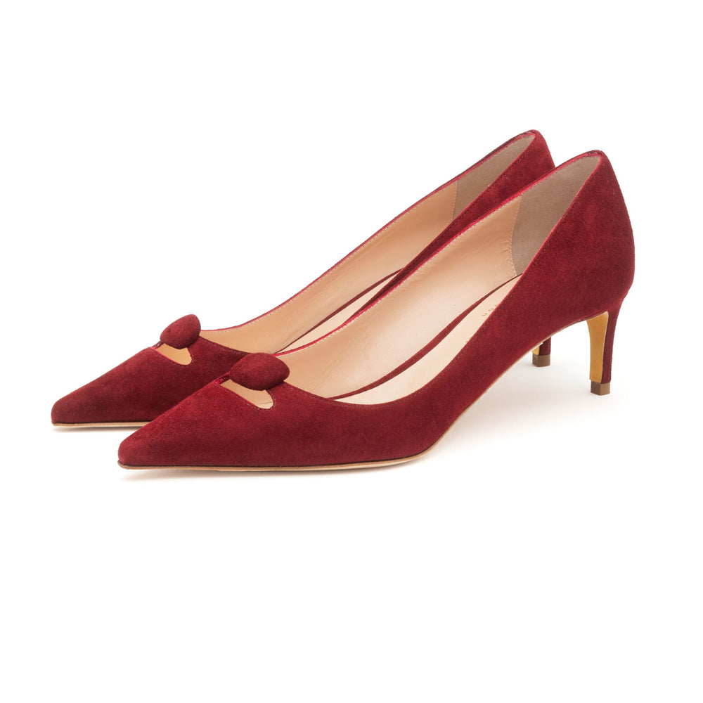 Sybilla steps into Fall as the modern pump reimagined. Elevated on a 55mm heel and adorned with a petite tone-on-tone version of our signature pebble, the silhouette is sculpted on the iconic ‘Vanga’ last and finished in Merlot suede - the perfect autumnal burgundy