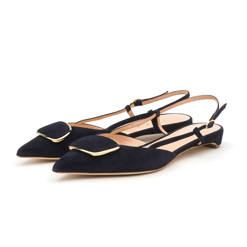 Introducing Juliette, our newest flat slingback in Notte Suede. Exuding understated charm and style in a dark navy, the 10mm micro heel complements a pointed toe, crowned with our double pebble. Pair it effortlessly with any ensemble in your wardrobe for a versatile and timeless style.