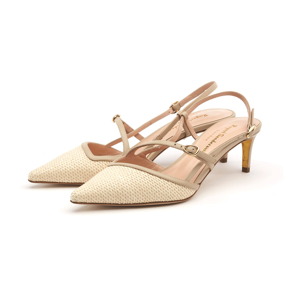 The Suez slingback in Natural Weave Calf is a perfect balance of sophistication and allure. Featuring a pointed toe and delicate sheer mesh, this style creates an elegant, barely-there effect while offering structured support with calf trim and slim straps.