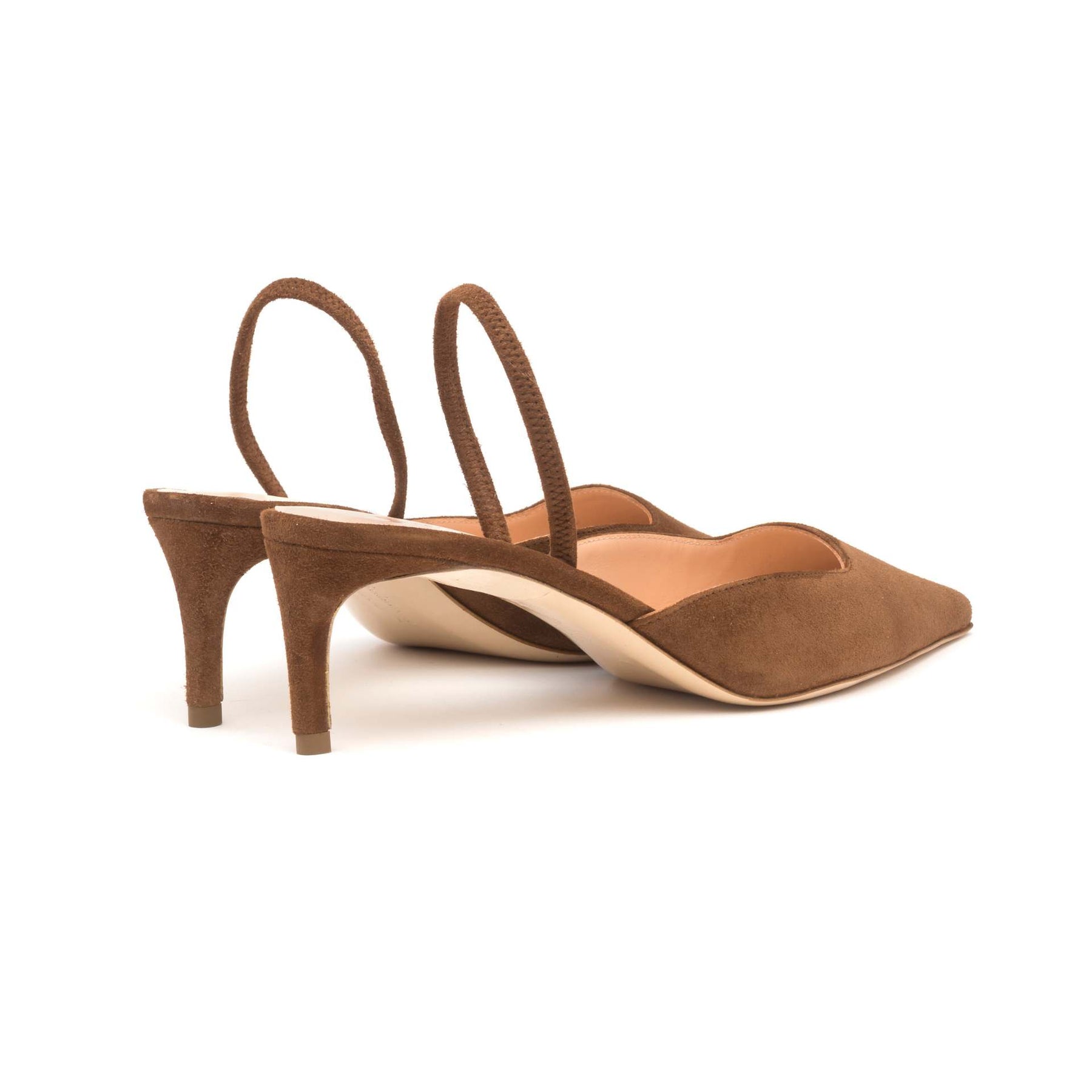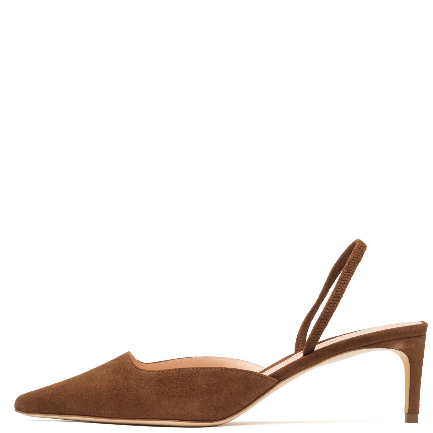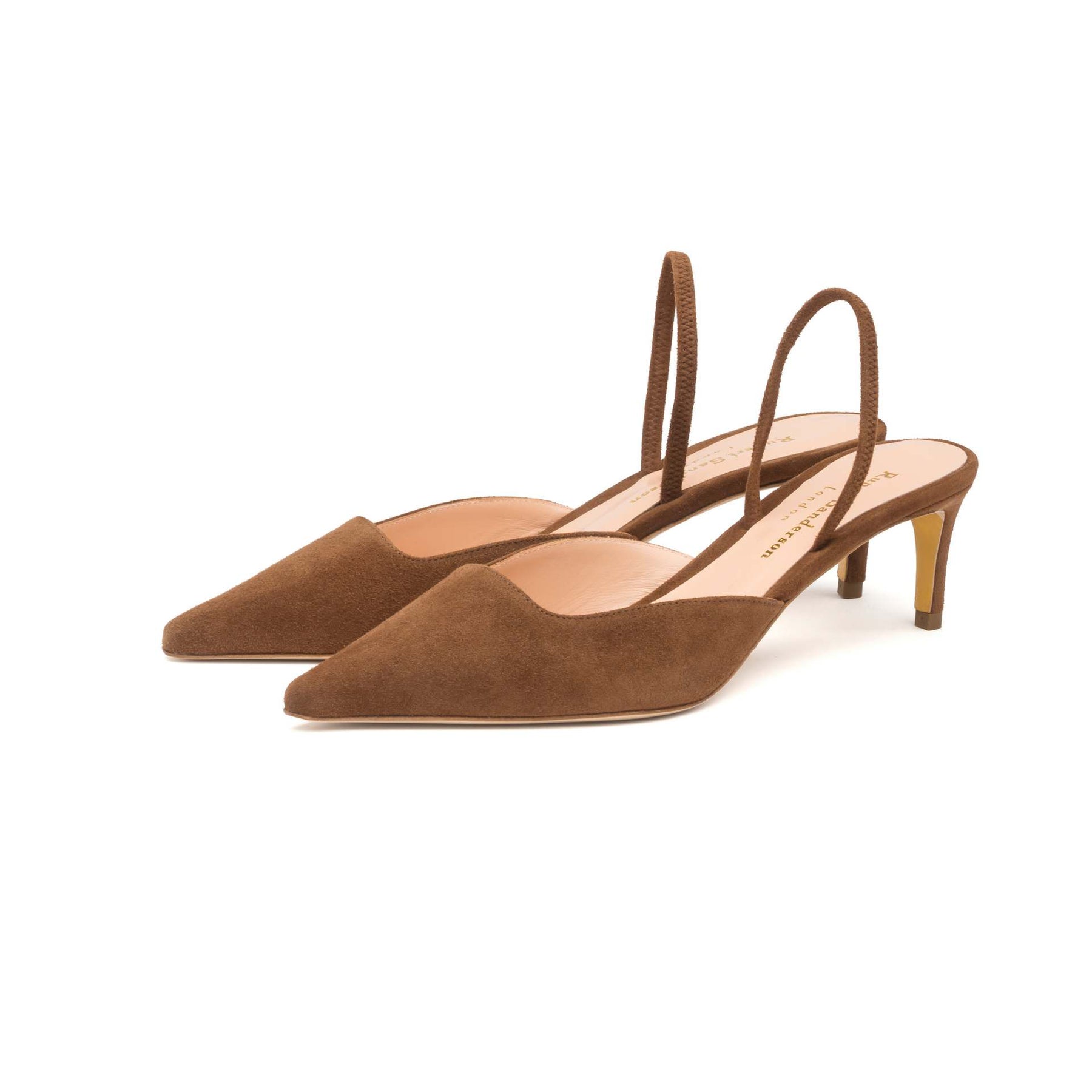 Rupert Sanderson Aminta in Ganache Suede is crafted in a rich coffee-toned finish with a sleek 55mm heel. Designed with an elasticated slingback strap for comfort and ease, this refined silhouette offers understated elegance and effortless day-to-evening wear.