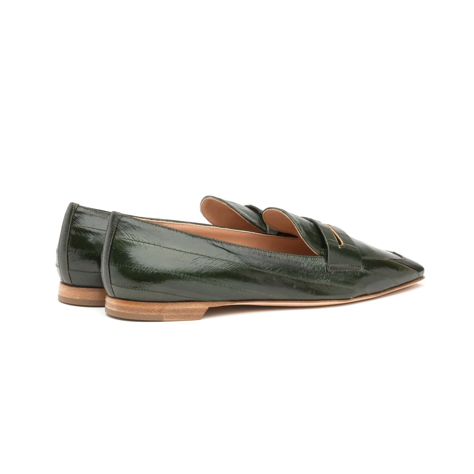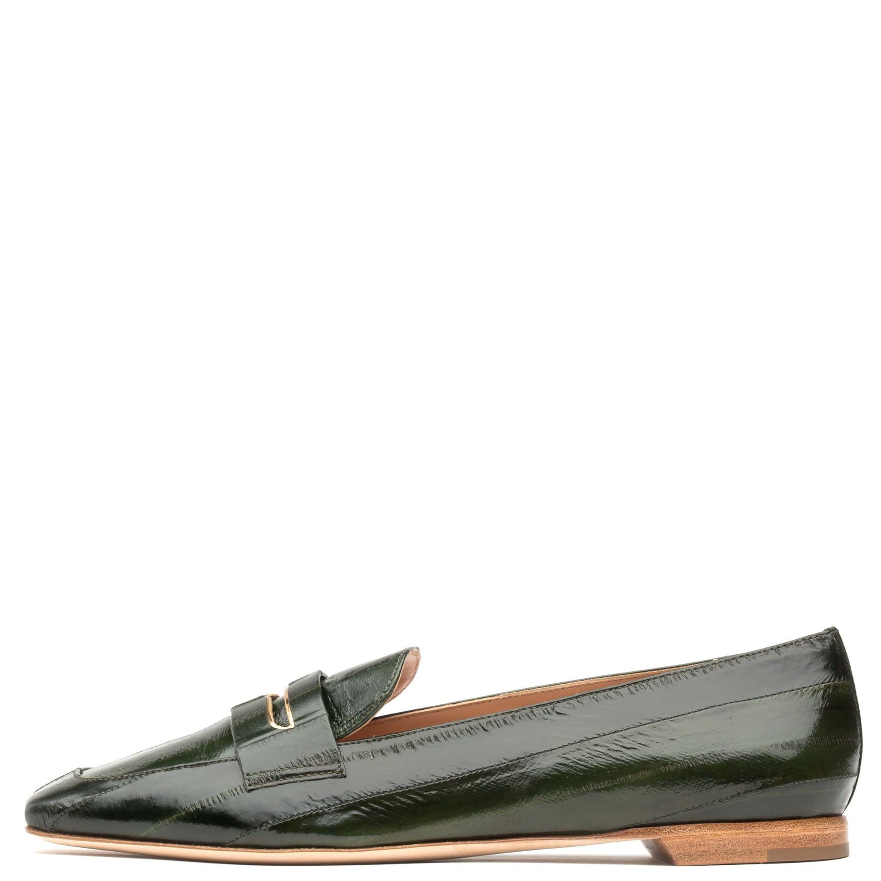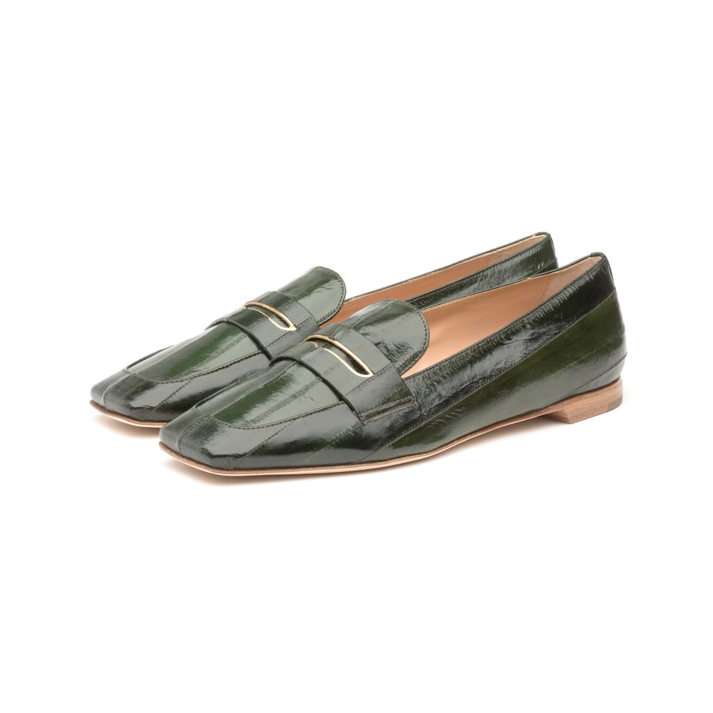 Doublet returns this seaon in an elevated Green eel. This penny loafer, set on a 5mm monoblocco heel with a blunt square toe, blends masculine structure with retro-inspired shine for a stylish, modern finish.