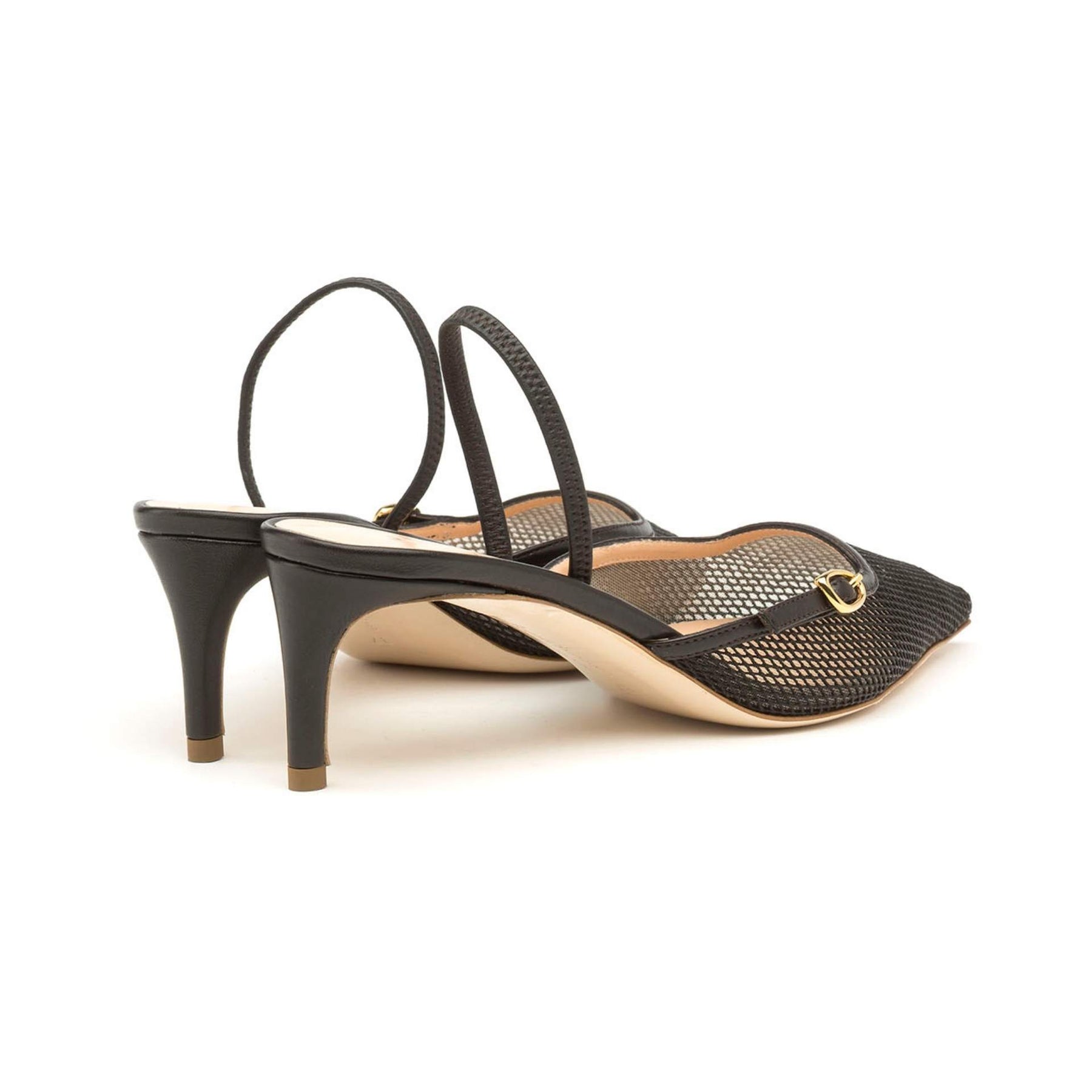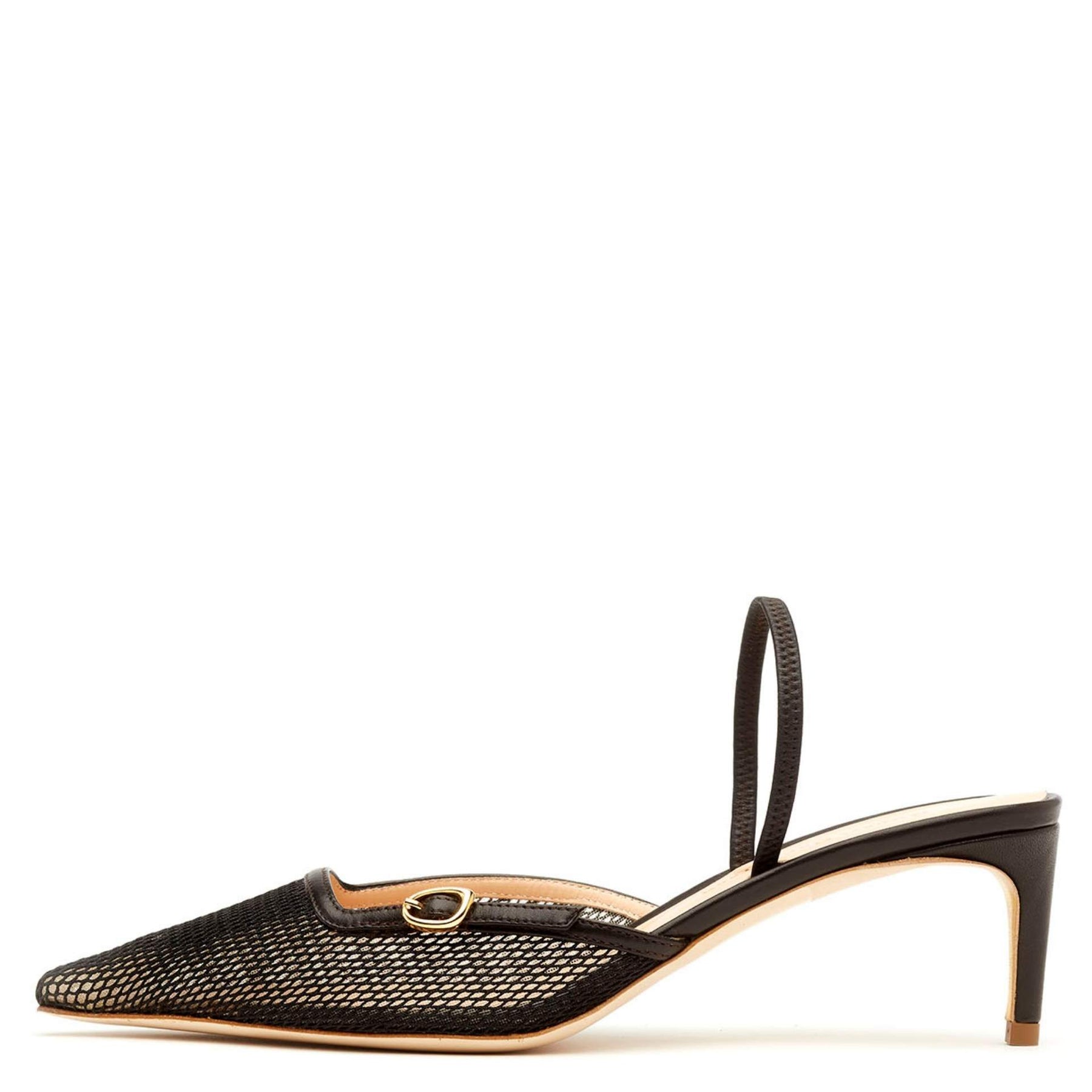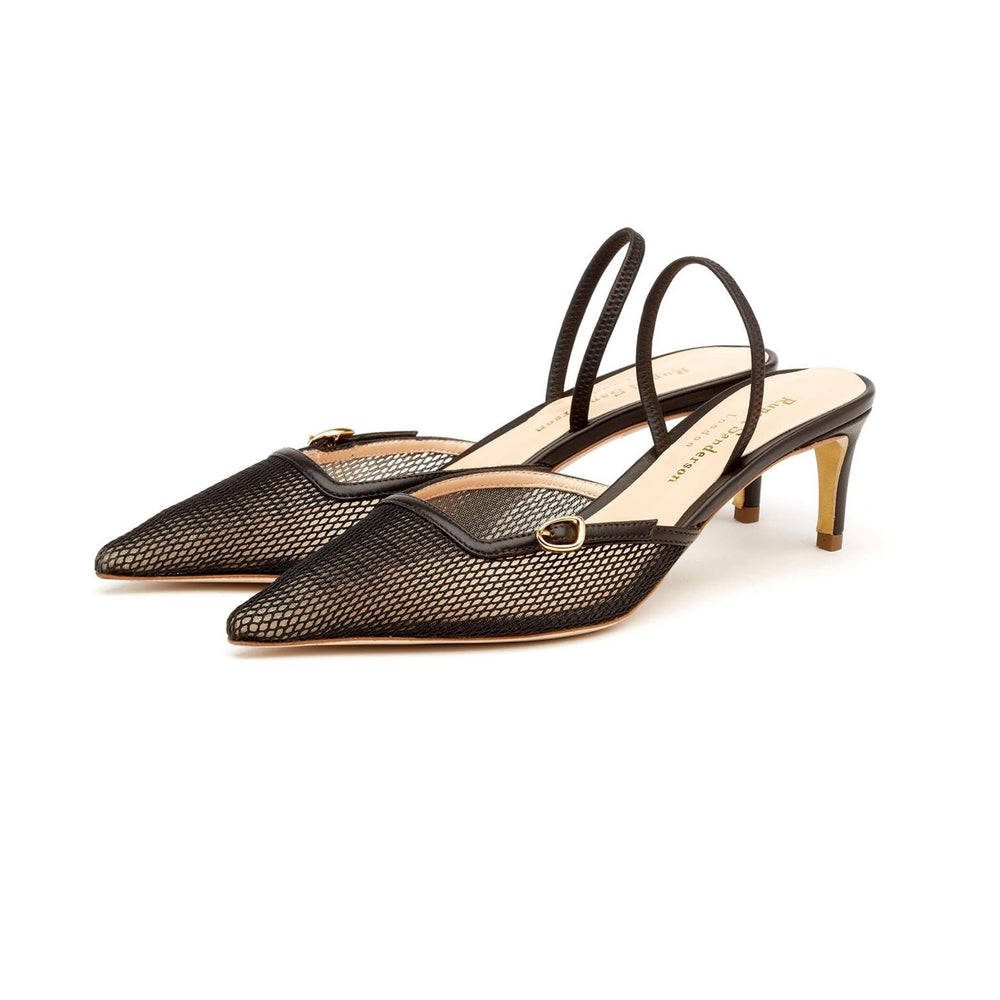 Rupert Sanderson Orono in Black Diamond Mesh Calf combines sleek sophistication with modern detailing. Featuring an elasticated slingback for a secure fit and a mesh mini buckle accent, it sits on a 55mm heel for polished, effortless elegance.