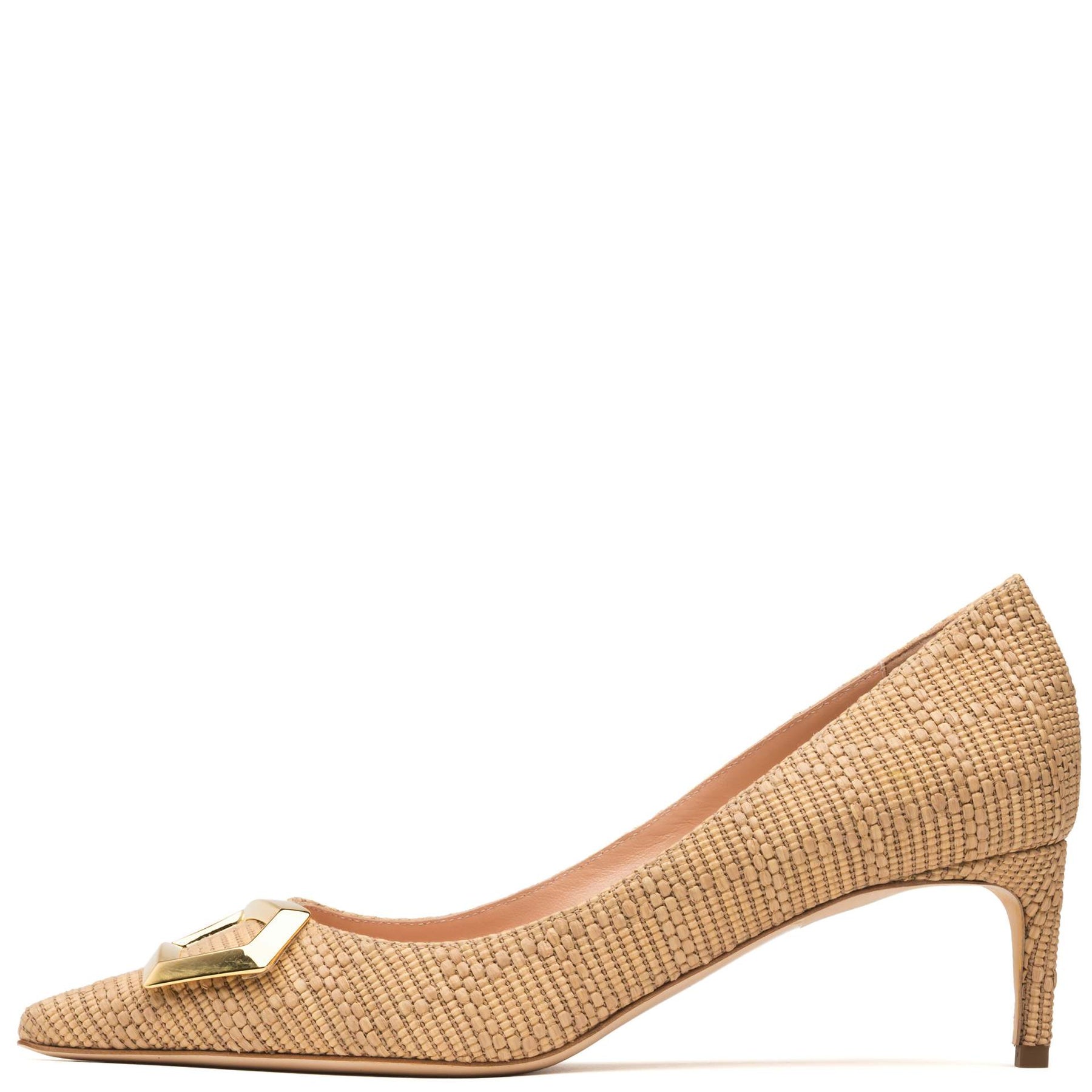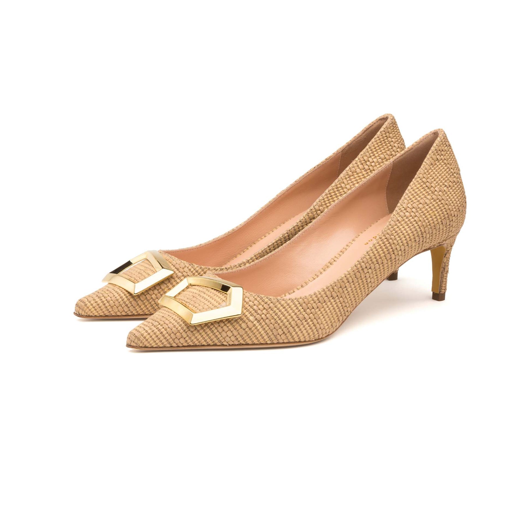 Rupert Sanderson Osella in Barley Checkered Weave is elevated with a refined gold cubic detail. Set on a sleek 55mm heel, this textured silhouette blends artisanal craftsmanship with understated, modern elegance.